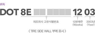 예: DOT 번호가 "DOT XXXX XXXX 1203"이라면, 이 타이어는 2003년 12주차, 즉 3월 말에 제조된 것입니다.