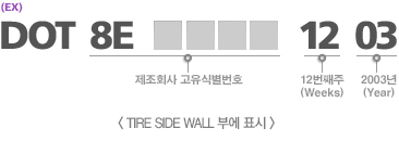타이어의 옆면을 보면 영문과 숫자가 표기되어 있습니다. DOT로 시작되는 문자열을 따라서 가다 보면 숫자 네 자리가 바로 생산일자인데 앞의 두 자리는 생산주수, 뒤에 두 자리는 생산연도입니다. 예를 들어, ‘1203’으로 표기되어 있다면 2003년 12주차(1년은 52주)에 생산되었다는 의미입니다. 타이어업체에서는 3년이 지난 타이어는 자체 폐기하도록 되어 있지만 간혹 양심불량 업체에서 이를 감추고 판매하기도 하므로 직접 확인하도록 합니다.