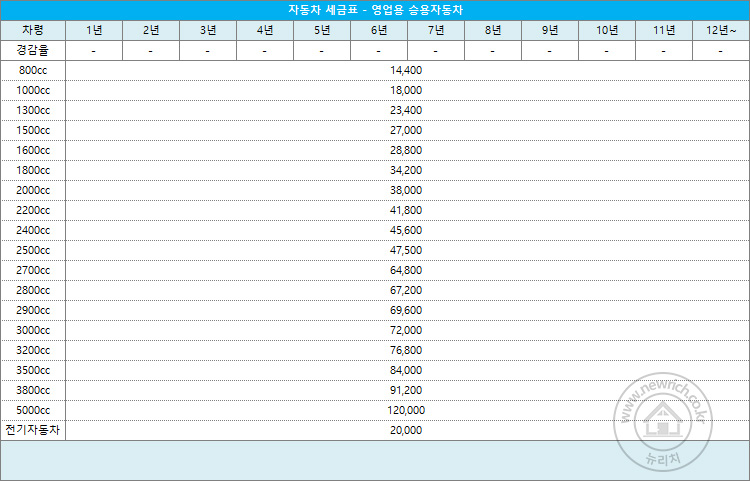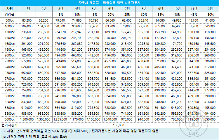 이 외에도 특정 조건에 따라 추가적인 세금이 부과될 수 있습니다. 예를 들어, 영업용 차량의 경우 일반 차량보다 높은 세금이 부과될 수 있습니다.
